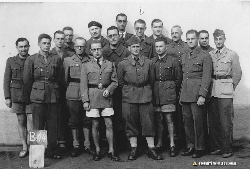 Oflag IIB Arnswalde : de gauche à droite : 1er = Henri CLUZEL – 2ème BUCHARLES ou BURCKHARD Charles – 3ème et 4ème = ? – 5ème = MALLERET – 6ème (portant un béret = Paul LACHAUD – 7ème devant lui en short blanc = ? – 8ème à 10ème = ? – 11ème = Georges THOMAS (Block 2, stube 212 avec lunettes et nu tête) – 12ème = ? - 13ème en short = Gilbert DESCHAUMES – 14ème et 15ème = ? – 16ème = Marcel GATELET – 17ème et dernier à droite Jean ANDRIEUX.