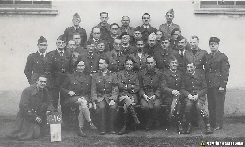 Oflag IIB – Arnswalde : second rang (1er rang des Officiers debourt : 4ème en partant de la droite : Maurice DELECOURT (calot et moustache), le 5ème est Albert DANEL (tête nue et maillot blanc).