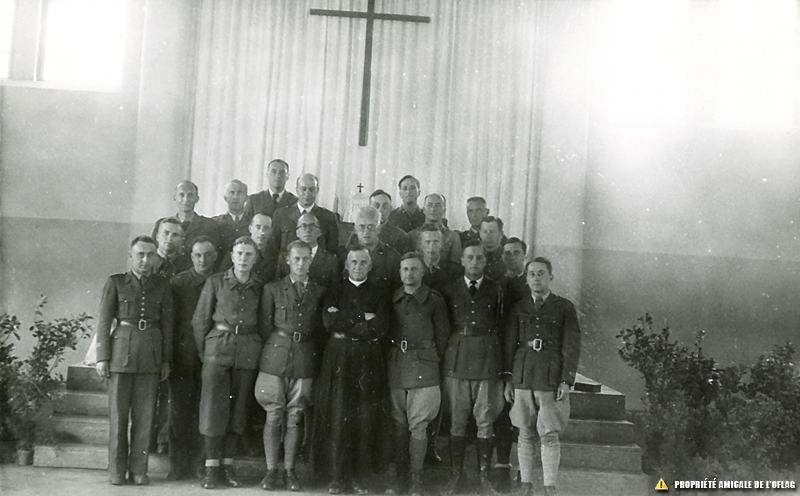 Oflag IIB – Arnswalde : photo de groupe de prisonniers inédite car elle est la seule prise à cet endroit, à part certaines qui sont prises au cours de messes. Le seul prisonnier identifié actuellement est le Père Henri DUPAQUIER.