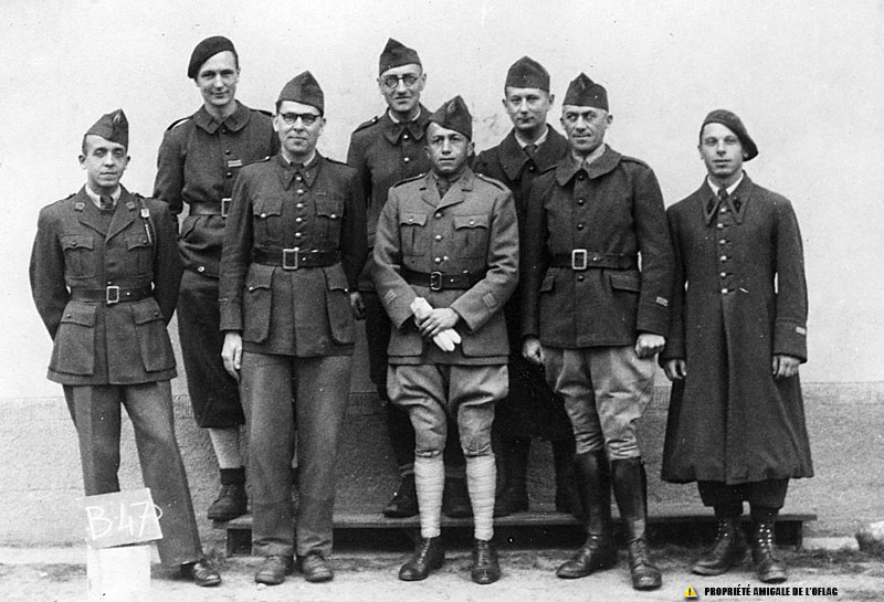 | Oflag IIB d'Arnswalde : Officiers du 129ème Régiment d'Infanterie. 1er rang : le capitaine Pierre CARCEL est au milieu avec des gants blancs. Le 2ème en partant de la droite est Raymond JACQUES. 2ème rang : le lieutenant Pierre COLIN est au milieu. Il porte un calot et des lunettes.