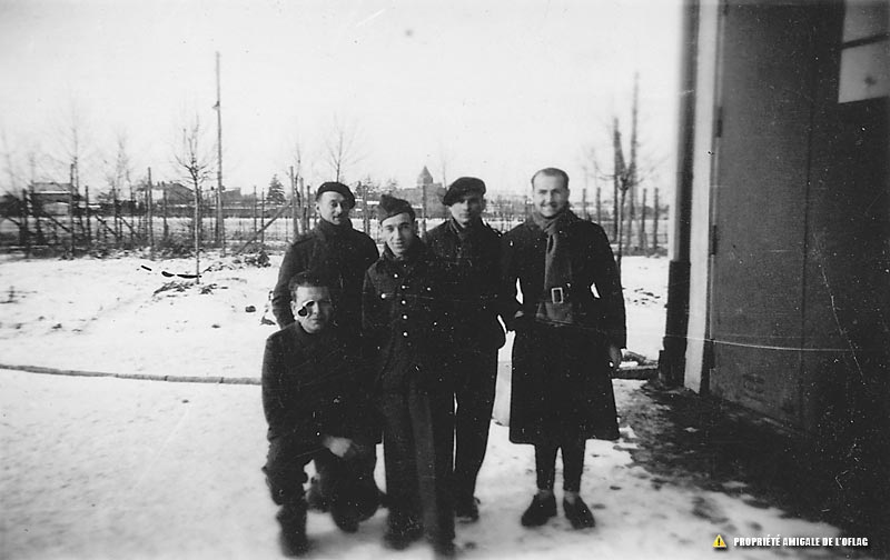 Oflag IIB d'ARNSWALDE : l'officier accroupi est Michel LE BIHAN. Debout : le 2ème en partant de la gauche : lieutenant VERGÈS (portant un calot). Le plus à droite est le lieutenant Bernard JACHEET. On aperçoit au loin le clocher de l'église d'Arnswalde