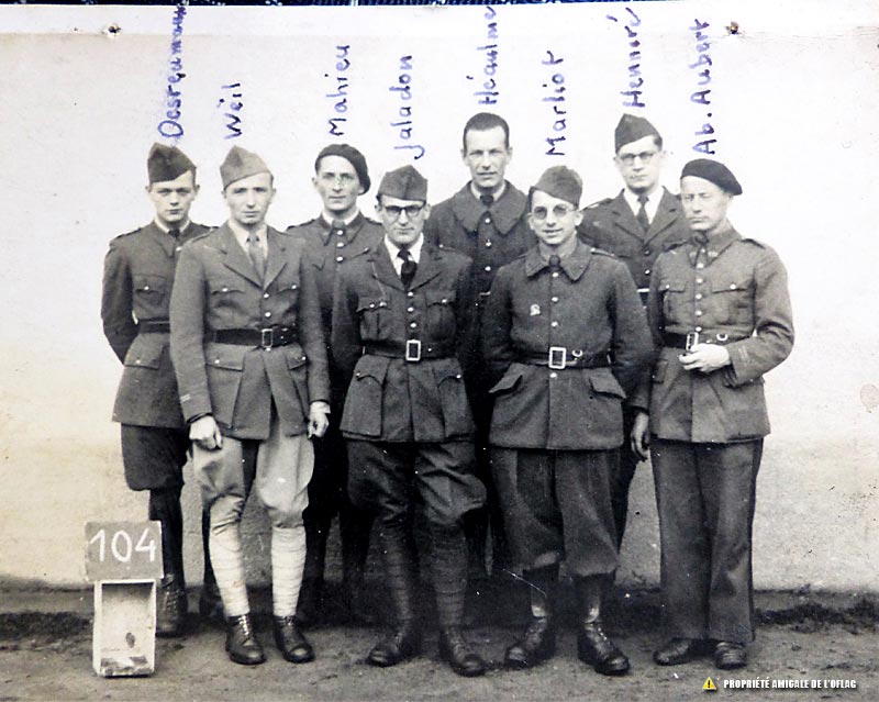Oflag IIB d'Arnswalde : de gauche à droite : René DESREMAUX – Pierre ou Max ou Bertrand WEIL – Joseph MAHIEU – Emile JALADON – Jacques HEAULME – Victor MARLIOT – Abel HENNERE - ? AUBERT.