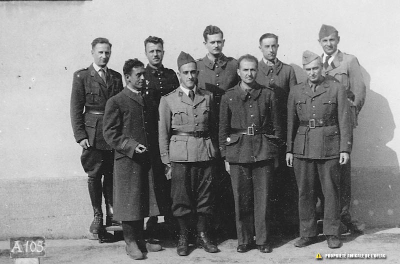 Oflag IIB d'ARNSWALDE : neuf « anciens élèves » de l'Ecole Supérieure de Commerce de Paris (ESCP ou SUPDECO), Officiers prisonniers de guerre. Le lieutenant Bernard JACHEET est au 1er rang, le 2ème en partant de la droite. Les noms des 8 autres officiers présents sur cette photo ne sont pas connus. |