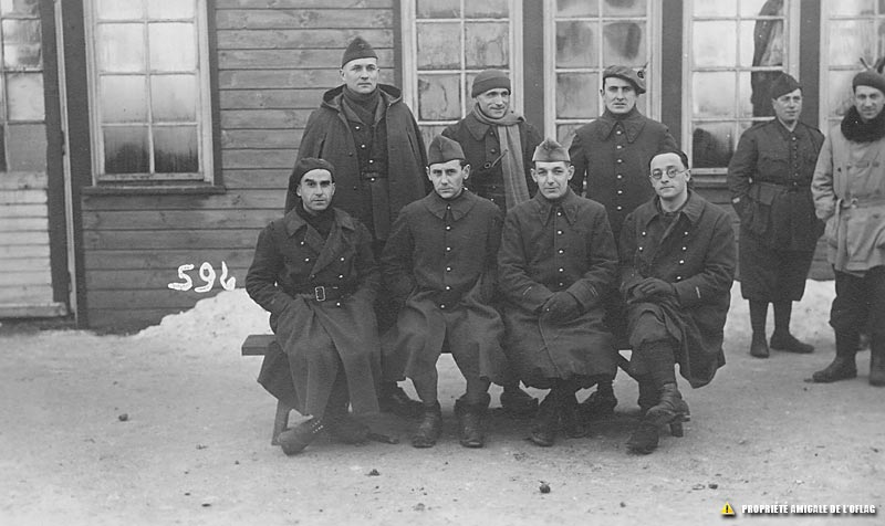 Oflag IID – GROSS-BORN : 1er rang et 2ème en partant de la droite : Lieutenant Marcel DESCROUEZ. Debout et 1er à gauche : Lieutenant Daniel LANDAS.