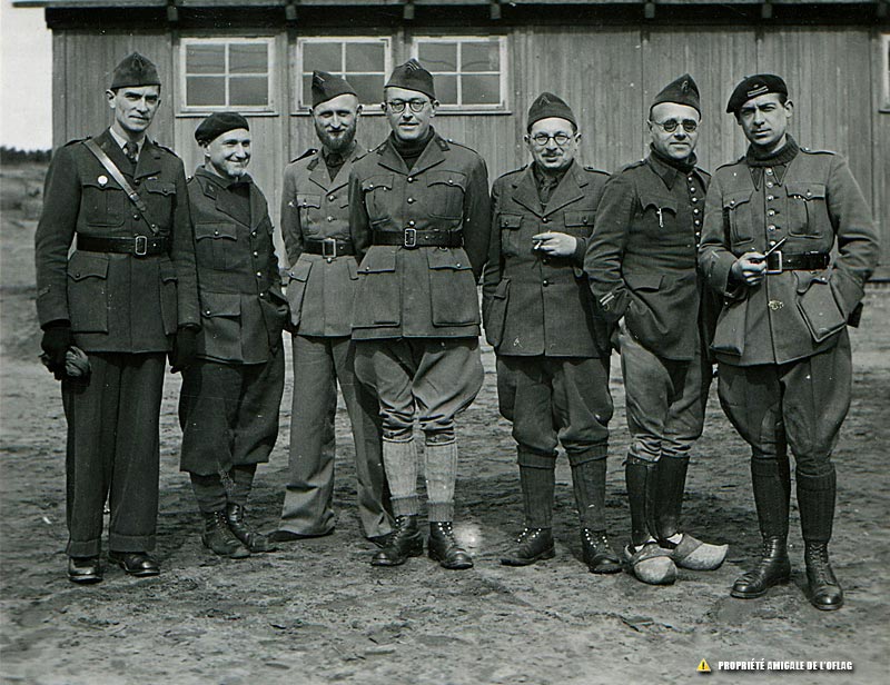 Gross-Born – Oflag IID : 25 Mai 1941 – Etat-major de la 68ème Division d'Infanterie : -Le 1er en partant de la droite est le Lieutenant Robert VALLET, -Le 3ème en partant de la droite serait le lieutenant Robert LEVY, -Le Capitaine RENARD serait au centre, -Le 1er en partant de la gauche serait le lieutenant Emile DESMARES, -Le 2ème en partant de la gauche est le Lieutenant Lionel CARVALLO, -Le 3ème en partant de la gauche et portant une barbe est le lieutenant Charles MARCUART. Les autres prisonniers ne nous sont pas connus. |
