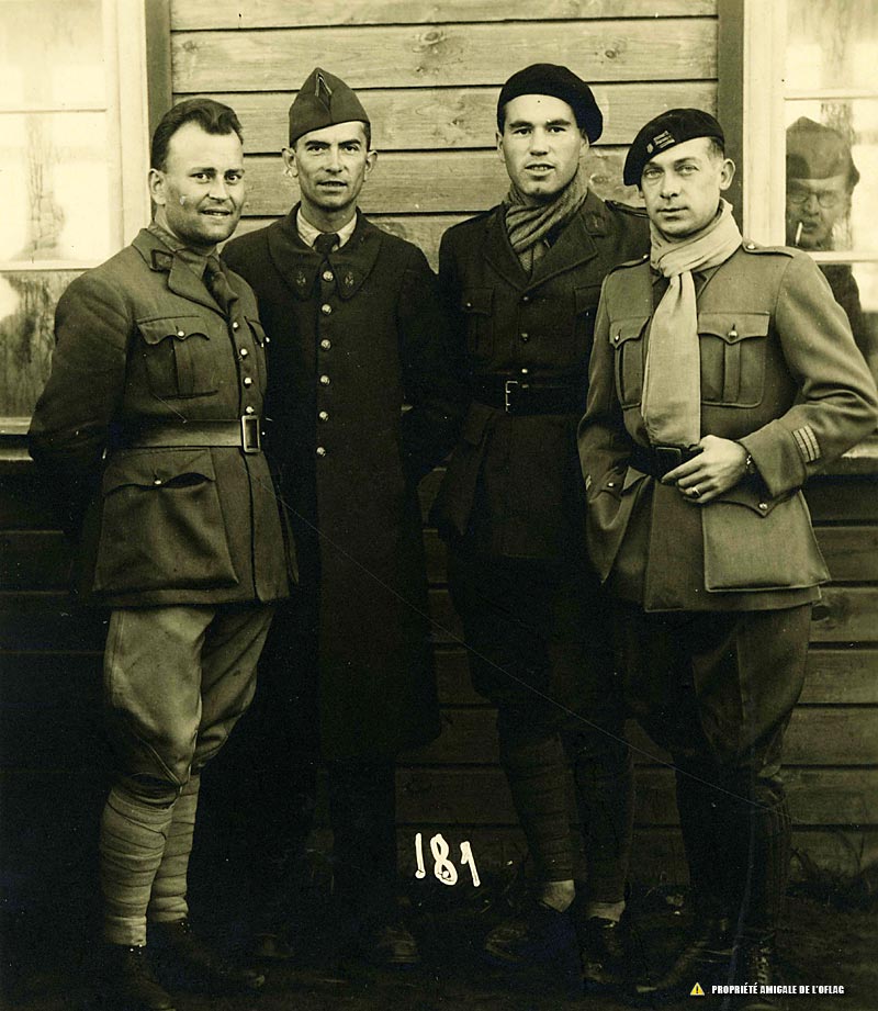 Gross-Born – Oflag IID : de gauche à droite : lieutenants Paul UHRIG (vraisemblablement), Émile DESMARRE, sous-lieutenant ? AUBERT (vraisemblablement) (ordonnance du général Beaufrère, commandant la 68ème D.I. à Dunkerque), capitaine Robert VALLET.