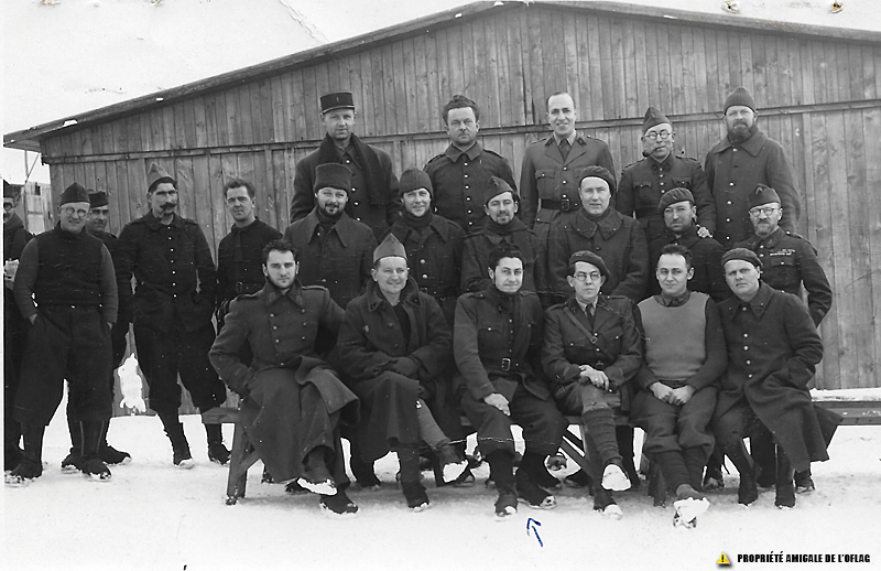 Oflag IID – Gross-Born : le lieutenant France MERCIER est au premier rang des Officiers assis, le 4ème en partant de la droite. Les noms des 18 autres prisonniers de ce groupe (et des personnes hors groupe à gauche) ne nous sont pas connus. Photo datant de janvier 1941.