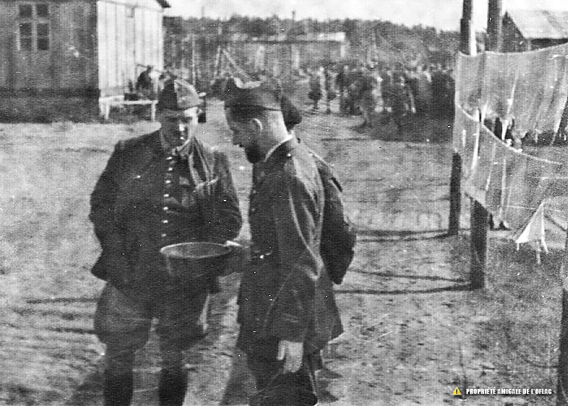 Gross-Born – Oflag IID = « Le Capitaine BARUTEAU examine la soupe » (à gauche et de face portant un calot) ».