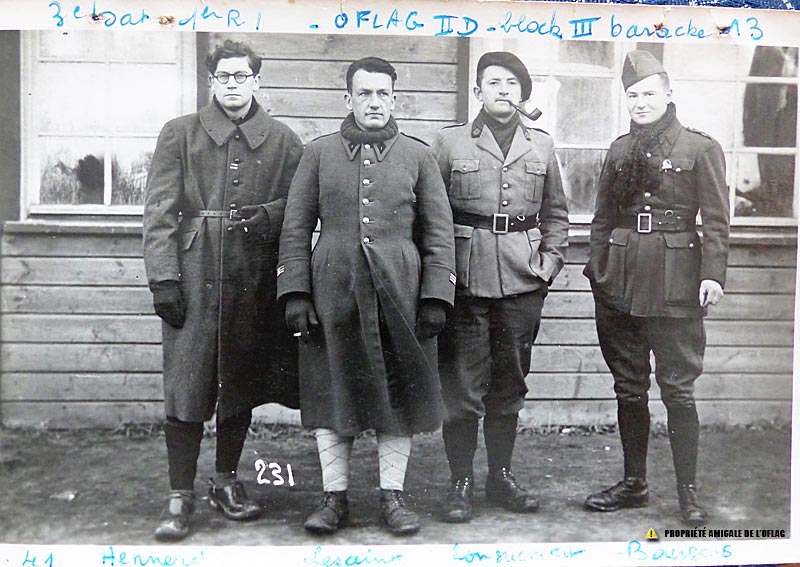Oflag IID de Gross-Born : de gauche à droite : lieutenant Abel HENNERE – capitaine Maurice LESAINT – lieutenant Antoni LONGUEMART - Jean BOURGOIS ».