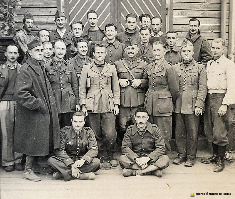 Oflag IID - Gross-Born : Pierre TOUZE est au tout dernier rang, le 1er en partant du bord droit de la porte, tête nue et pull-over. Les noms des 23 autres prisonniers figurant sur cette photo ne nous sont pas connus. Oflag IID - Gross-Born : Pierre TOUZE stoi w ostatnim rzędzie, pierwszy od prawej krawędzi drzwi, z gołą głową i w swetrze. Oflag IID - Gross-Born : Pierre TOUZE is in the very last row, the first from the right edge of the door, bareheaded and wearing a pullover. The names of the 23 other prisoners in this photo are not known to us.