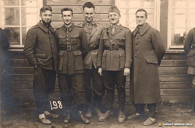 Oflag IID – Gross-Born : de droite à gauche : 1er : Henri, VILLETTE - 2ème : Alfred MOURGUES - 3ème : Lucien COUSIN. Les noms des 2 autres prisonniers en partant de la gauche ne nous sont pas connus.