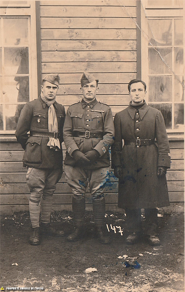 Oflag IID – Gross-Born : au centre le Capitaine Maurice LESAINT, à gauche le sous-lieutenant VINCENT et à droite le lieutenant MORA. Oflag IID – Gross-Born : w centrum kapitan Maurice LESAINT, po lewej podporucznik VINCENT i po prawej porucznik MORA. |