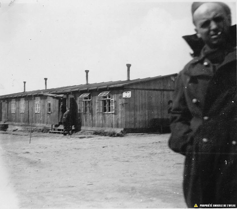 Oflag IID – Gross-Born : un Officier présent sur cette photo pourrait peut-être être identifié mais son nom n'est pas connu à ce jour. La « baraque » derrière lui semble être la « numéro 23 » du « Block 1 ». Oflag IID – Gross-Born: Oficer na tym zdjęciu mógłby być zidentyfikowany, ale jego nazwisko nie jest znane do tej pory. "Koszary" za nim wydają się być "numerem 23" "Bloku 1".