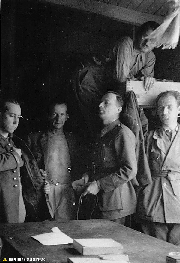 Oflag IID – Gross-Born : ces Officiers prisonniers ne sont pas identifiés. Toutefois Yves de Crémoux serait le deuxième en partant de la droite et Valentin Pillon en haut sur son châlit. Oflag IID – Gross-Born : ci oficerowie więźniowie nie są identyfikowani. Jednak Yves de Crémoux byłby drugi z prawej strony, a Valentin Pillon na szczycie na szalu.
