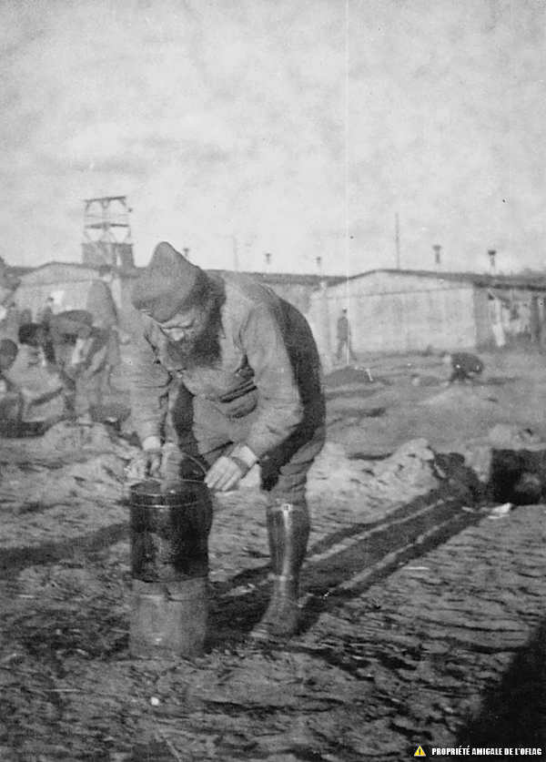 Oflag IID – Gross-Born : cet Officier prisonnier, en train de cuisiner en plein air, n'est pas identifié.