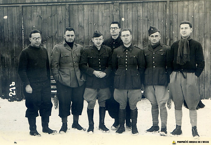 Oflag IID – Gross-Born : de droite à gauche : René BOIDIN, Henry de LAVERNHE, Albert SIMOËNS, ? , Jean DOYEN, Henri RAMAUD, Louis TALLARD. Oflag IID - Gross-Born : od prawej do lewej : René BOIDIN, Henry de LAVERNHE, Albert SIMOËNS, ? , Jean DOYEN, Henri RAMAUD, Louis TALLARD.