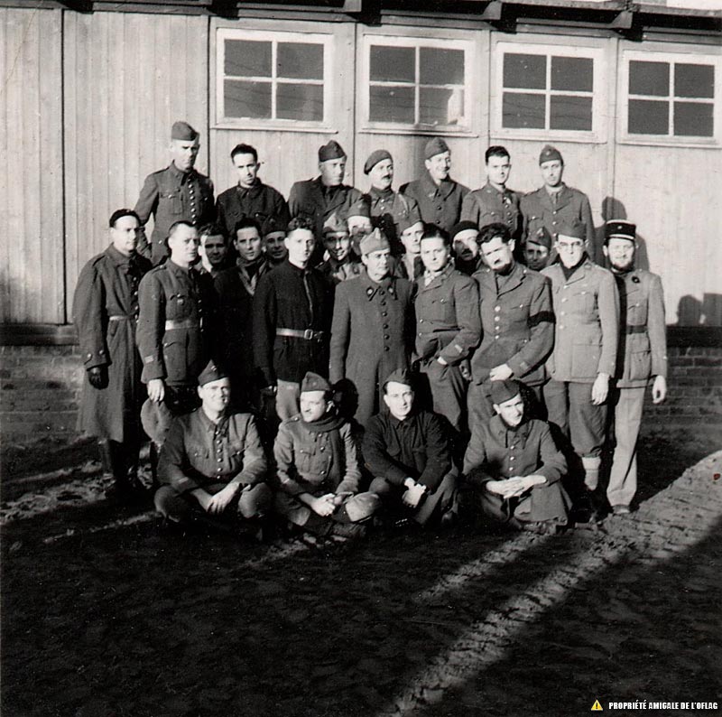 Oflag IID - Gross-Born : un groupe de 26 prisonniers dont un seul est identifié, le capitaine Georges BOISSEAU au dernier rang au centre. Oflag IID - Gross-Born : grupa 26 więźniów, z których tylko jeden jest zidentyfikowany, kapitan Georges BOISSEAU w ostatnim rzędzie w środku.