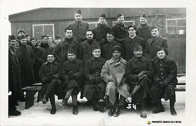 Pierwszy rząd, siedzący od lewej: porucznik MARCEAU, nauczyciel, kapitan Edmond GUYOMAR, profesor matematyki, kapitan Henri AUZARY, nauczyciel, kapitan DESVIGNES, oficer, kapitan Gustave MANGIEU, oficer, kapitan Maurice LECOURT, współkierownik firmy "épicerie en gros LECOURT".