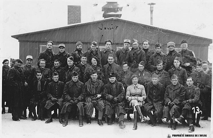 Oflag IID – Gross-Born : le Commandant Louis COTTRELLE, matricule 203, Block 3, Barack 1, Stube 1, est le 7ème Officier du 2ème rang en partant de la gauche, béret en travers sur la tête.