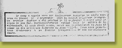 Faire-part de décès du Soldat Georges DELPIERRE paru dans le journal des prisonniers, "Ecrit sur le Sable", le n° 35 du 26 septembre 1943. |