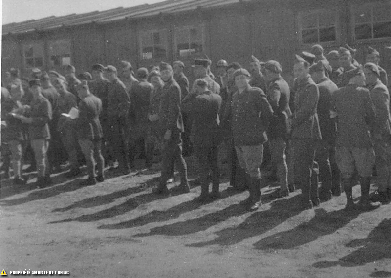 Oflag IID – Gross-Born : un appel est en cours. Comme cette opération peut durer… on distingue un prisonnier en train de lire.