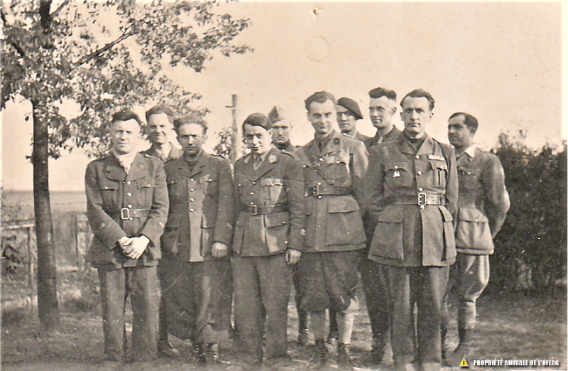Le Capitaine Maurice LESAINT est le second en partant de la droite au 1er rang. Le 3ème devant en partant de gauche et devant est le Lieutenant Jean (Jules, Raymond) SIMON (dit « Mickey ») (Tirailleur). Kapitan Maurice LESAINT jest drugi od prawej do 1. rzędu. 3. z przodu zaczynając od lewej i z przodu jest porucznik Jean (Jules, Raymond) SIMON (znany jako "Mickey") (Tirailleur).