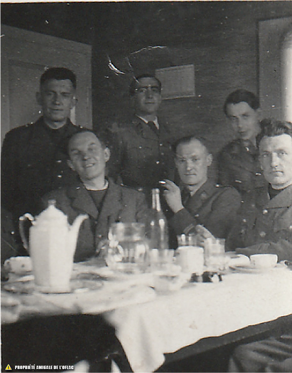 Les noms des 5 autres Officiers ne nous sont pas connus. Cette photo est prise à l'intérieur d'une habitation civile allemande dont les habitants avaient été chassés par l'armée Britannique après la découverte du camp de concentration de Bergen-Belsen proche de la ville de Bergen.