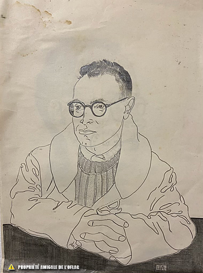 Oflag IID – Gross-Born : dessin représentant Pierre REVOL, membre de l'équipe des évadés du tunnel tragique du 18 mars 1942. Oflag IID - Gross-Born : rysunek przedstawiający Pierre'a REVOLA, członka ekipy uciekinierów z tragicznego tunelu z 18 marca 1942 r. Oflag IID - Gross-Born : drawing showing Pierre REVOL, a member of the team of escapees from the tragic tunnel of 18 March 1942.