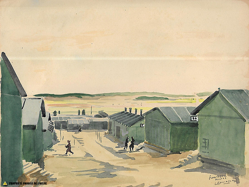 Oflag IID : « Baraquements - avril 1940 » – aquarelle de Lucien ROMAGNAN.