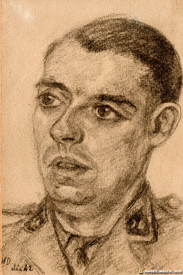 Un Officier du 26ème G.R.D.I., peut-être le lieutenant Albert MOUISSET ? L'auteur est « HD » et le dessin daté de décembre 1942. (Don à l'Amicale de l'Oflag IID-IIB-XXIB de Monsieur José GARCIA-ALVAREZ, collectionneur que nous remercions).
