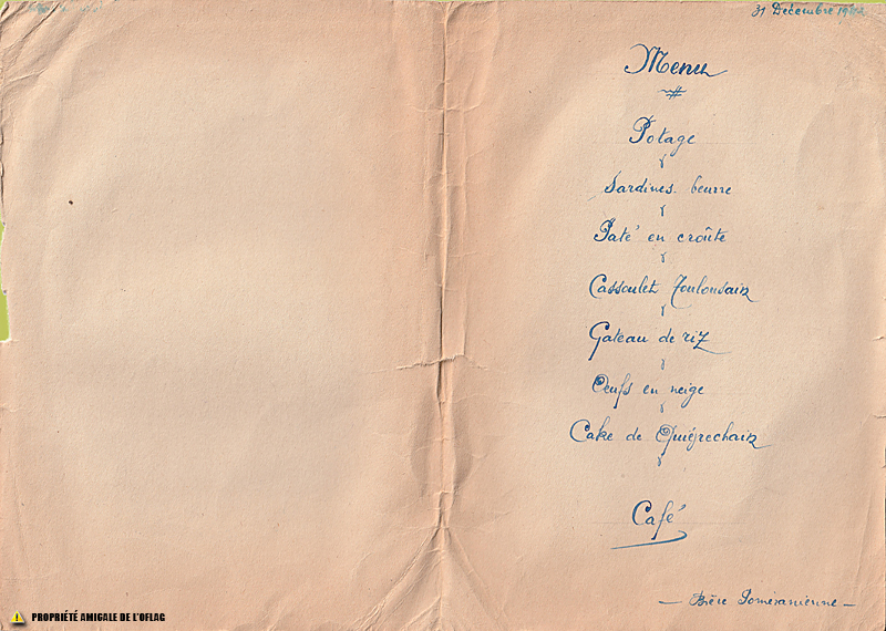 Dessin menu du repas du 31 décembre 1942 du Lieutenant Evariste LEMAIRE : « Ecrit sur le Sable vous présente ses meilleurs vœux ». Drawing of the menu of the meal of December 31, 1942 of Lieutenant Evariste LEMAIRE: "Ecrit sur le Sable presents you its best wishes".