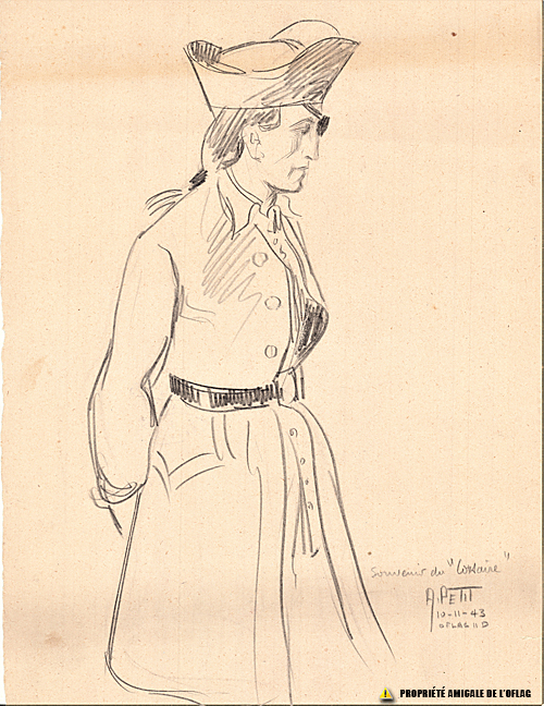 Lieutenant Roger BOUCHERON – « Souvenir du corsaire » signé « A. PETIT - 11 novembre 1943 - Oflag IID ». La date peut indiquer que le dessin a en fait été réalisé à l'Oflag IIB, car en 1943 les prisonniers s'y trouvaient depuis mi-mai 1942. Il représente Roger BOUCHERON dans un rôle qu'il a en fait peut-être joué à l'Oflag IID ? Porucznik Roger BOUCHERON - "Souvenir du corsaire" podpisany "A. PETIT - 11 listopada 1943 - Oflag IID". Data może wskazywać, że rysunek został faktycznie wykonany w Oflagu IIB, gdyż w 1943 r. więźniowie przebywali tam od połowy maja 1942 r. Przedstawia Rogera BOUCHERONA w roli, którą mógł rzeczywiście odegrać w Oflagu IID ? Lieutenant Roger BOUCHERON - "Souvenir du corsaire" signed "A. PETIT - 11 November 1943 - Oflag IID". The date may indicate that the drawing was in fact made in Oflag IIB, because in 1943 the prisoners had been there since mid-May 1942. It depicts Roger BOUCHERON in a role that he may have actually played in Oflag IID ?