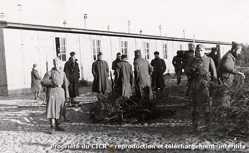 Oflag IID – Gross-Born : Prisonniers Français et deux gardiens allemands. Les branchages sont vraisemblablement rapportés par les prisonniers quand ils vont faire des corvées de dessouchage à l'extérieur du camp pour avoir plus de combustible à bruler dans les poêles des « stubes » (chambres).