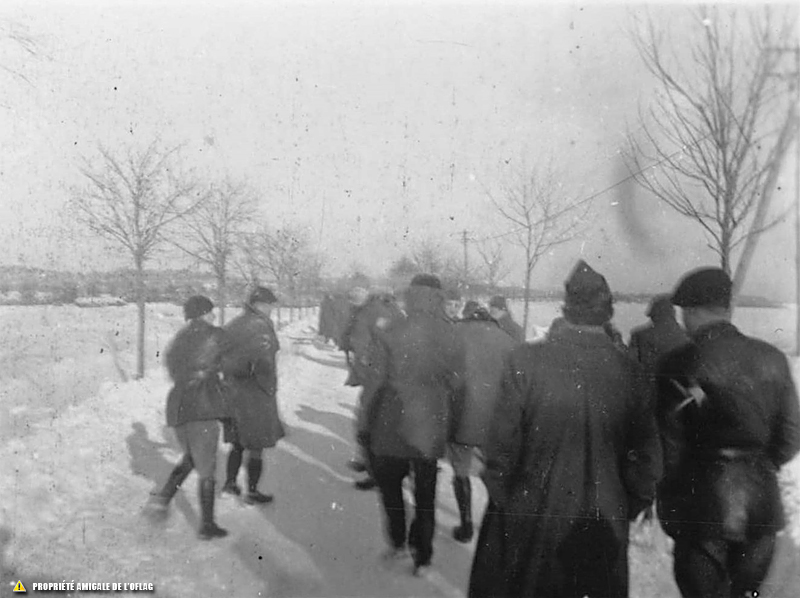 Oflag IID – Gross-Born : la seule photo en notre possession à ce jour prise au cours d'une promenade. C'est au cours de deux de celles-ci que s'évaderont vers la Russie le groupe « BILLOTTE – de PERSON – RICHEMONT » puis le groupe « de BOISSIEU – BRANET – KLEIN » remplacés par des mannequins durant les appels suivants. Oflag IID – Gross-Born : jedyne zdjęcie w naszym posiadaniu zrobione podczas spaceru. To właśnie podczas dwóch z nich ucieknie do Rosji grupa "BILLOTTE – de PERSON – RICHEMONT", a następnie grupa "de BOISSIEU – BRANET – KLEIN" zastąpiona modelami podczas kolejnych rozmów.