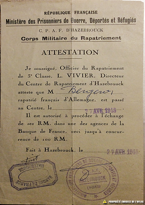 Attestation officielle permettant au lieutenant André BERGERON de changer ses Reich marks en Francs Français.
