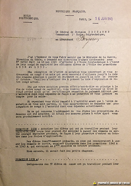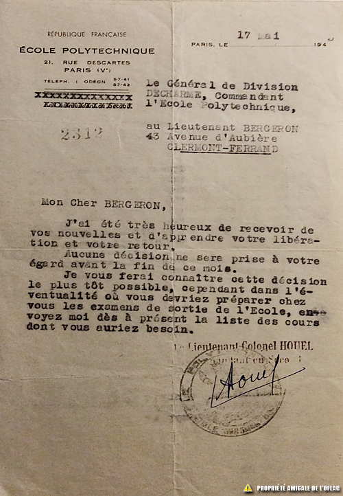 Document de l'école polytechnique adressés au lieutenant André BERGERON dès son retour et qui concernent son avenir.