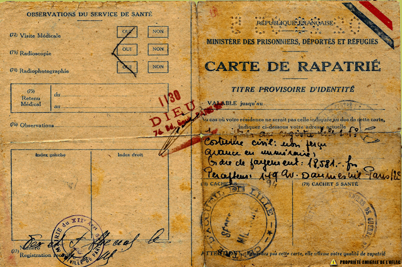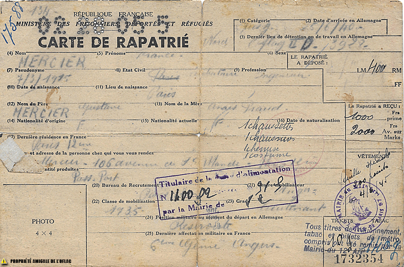 Carte de rapatriement du Lieutenant France MERCIER recto -