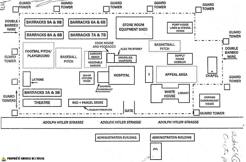 Oflag XXIB SCHUBIN : plan de l'Oflag XXIB de Schubin dressé vers la fin de la guerre à l'époque au cours de laquelle des prisonniers américains y ont été détenus. Ceux-ci ont effectué à partir de début janvier 1945 une marche « forcée » vers l'ouest couvrant 700 kilomètres. |