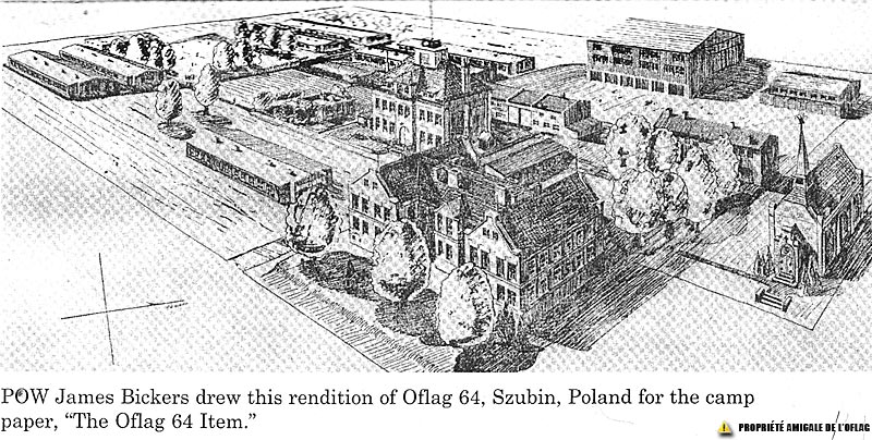 Oflag XXIB SCHUBIN : vue de l'Oflag XXIB de Schubin dessinée vers la fin de la guerre à l'époque au cours de laquelle des prisonniers américains y ont été détenus. Ceux-ci ont effectué à partir de début janvier 1945 une marche « forcée » vers l'ouest couvrant 700 kilomètres. |