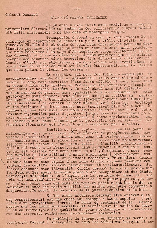 Page 2 de l’article du Colonel Gonnard, chef des 354 officiers français prisonniers arrivés dès juin 1940 à l’oflag IIB où ils restèrent jusqu’au 8 novembre 1940.