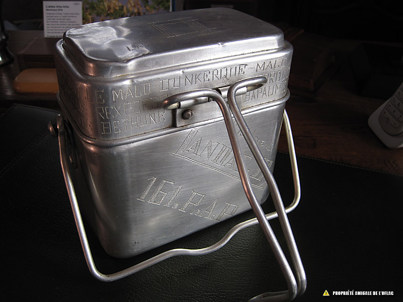 Gamelle fabriquée par le lieutenant Daniel LANDAS. Elle reprend les noms des étapes durant la période de guerre 1939-1940 puis les villes conduisant au camp de Gross-Born, lieu de sa captivité de 1940 à mai 1942.
