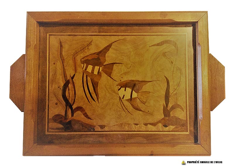 Oflag IIB d'ARNSWALDE : plateau en marqueterie avec poissons exotiques réalisé par le lieutenant Bernard JACHEET.