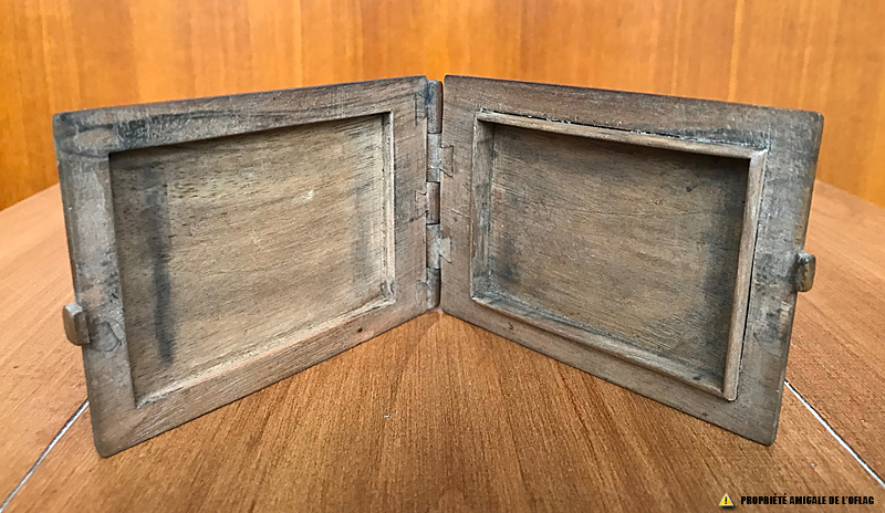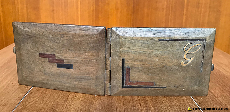 Small marquetry box "card holder" (external view) made by second lieutenant Georges THOMAS, prisoner of Oflag IID-IIB. It measures 10,5 cms long and 7 cms wide.