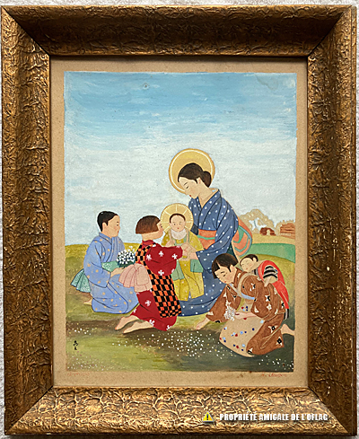 Vierge à l'Enfant réalisée par Henri CLAUZON à l'Oflag IID ou à l'Oflag IIB ? (25 cm de haut – 20 cm de large) dans le style japonisant qu'il appréciait particulièrement avant la guerre. Dziewica z Dzieciątkiem wykonana przez Henri CLAUZONA w Oflagu IID lub Oflagu IIB (25 cm wysokości - 20 cm szerokości) w japońskim stylu, który szczególnie lubił przed wojną. Virgin and Child made by Henri CLAUZON in Oflag IID or Oflag IIB (25 cm high - 20 cm wide) in the Japanese style that he particularly liked before the war.