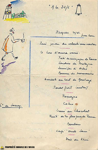 Oflag IID : « chambre 35 - stube 2 : menu du repas de Pâques 1941 » par Henri de SANCY (recto).