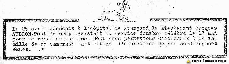 Faire-part de décès du Lieutenant Jacques AUBRON paru dans le journal des prisonniers, "Ecrit sur le Sable", le n° 32 du 15 mai 1943.