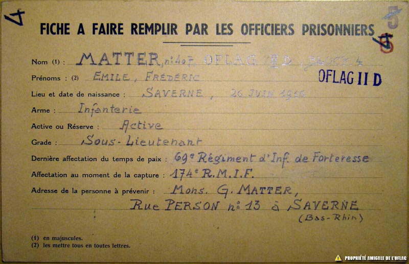 Lieutenant Emile MATTER, prisonnier de l'Oflag IID – « Fiche à faire remplir par les Officiers Prisonniers »