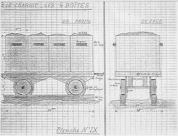 Dessin du chariot aux 4 boîtes pour l'évasion de 1942