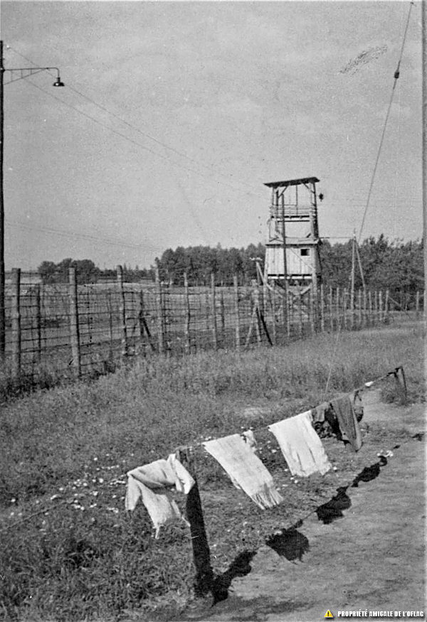 Oflag IID – Gross-Born : un des miradors entourant la camp et à partir desquels les barbelés sont illuminés la nuit. Au 1er plan, le fil que les prisonniers ne devaient pas franchir sous peine d'être mitraillés par les « posten » se trouvant dans les miradors. Oflag IID – Gross-Born : jedna z wież strażniczych otaczających obóz, z której w nocy oświetlony jest drut kolczasty. W 1 samolocie nić, której więźniowie nie musieli przekraczać pod karą bycia ostrzeliwanym przez "posten" w strażnicach.