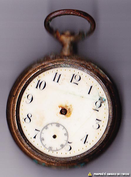 |  Gross-Born Oflag IID montre française. Elle a été retrouvée par Tomasz SKOWRONEK, Ingénieur de l’Office National des Forêts Polonais dans le sable de ce qui fut le camp et donnée au secrétaire général de l’Amicale Française de l’Oflag IID-IIB en juin 2003 |